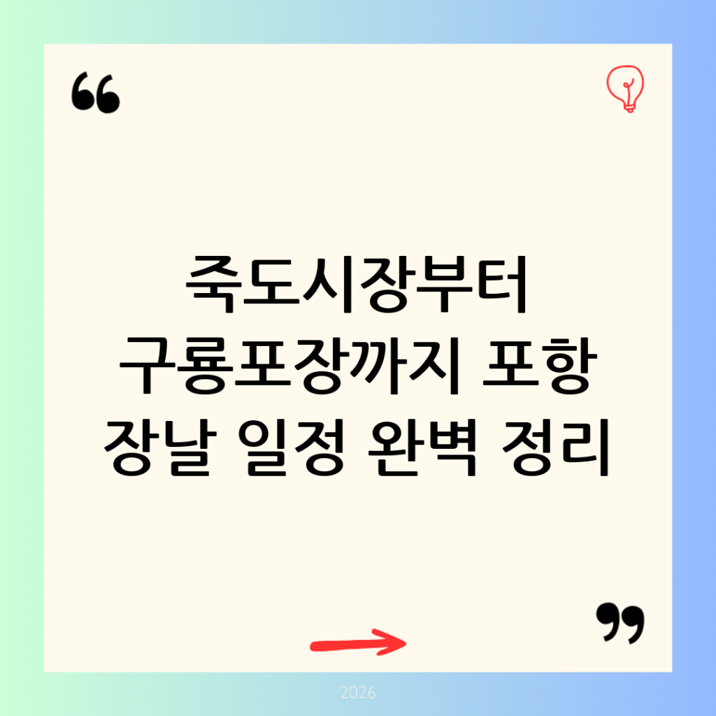 - 주차 팁: 죽도시장의 경우 타워형 공영주차장과 둔치 주차장 등 여러 곳이 마련되어 있으나, 주말이나 장날에는 전국에서 몰려든 인파로 인해 주차 대기 시간이 상당히 길어질 수 있습니다. 가급적 대중교통을 이용하거나, 오전 일찍 방문하여 주차 공간을 선점하는 것이 좋습니다. 오천장과 구룡포장 역시 장날에는 인근 도로가 매우 혼잡하므로 방문 전 공영주차장 위치를 지도 앱으로 미리 파악해 두시길 바랍니다.